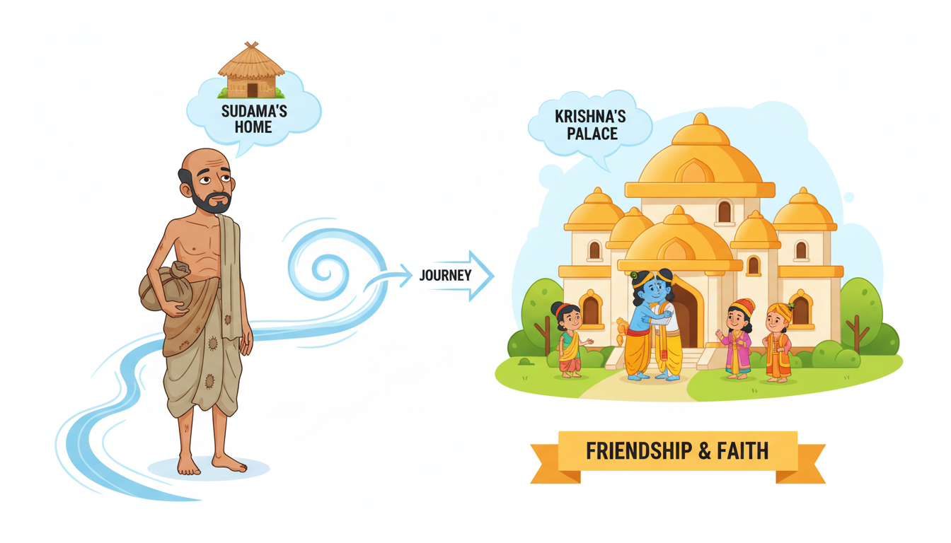 ठीक है सब लोग, आज हम 'सुदामा चरित' नामक एक सुंदर कविता का पता लगाने जा रहे हैं। यह सुदामा के अपने प्रिय मित्र भगवान कृष्ण के दर्शन करने की कहानी बताती है।