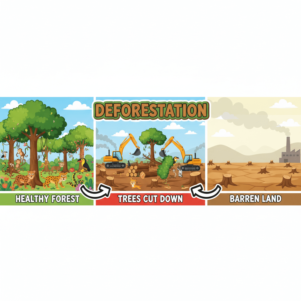 Deforestation is a major problem that poses a threat to plants and animals. Deforestation means cutting down forests for other purposes, such as for land, houses and factories, or cutting down trees for timber use.