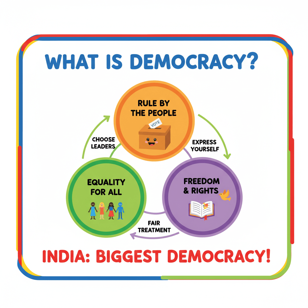 India is the world's largest democracy! Core principles such as Justice, Liberty, Equality, and Fraternity are very important to our democracy. Justice ensures everyone is treated fairly, regardless of gender, race, or religion. Liberty gives us freedom of thought, speech, and expression. Equality means every person is considered equal, and Fraternity encourages us to maintain unity despite our diversity. Our Constitution declares India as a democratic, secular, and socialist country, with the Preamble setting out these core beliefs.