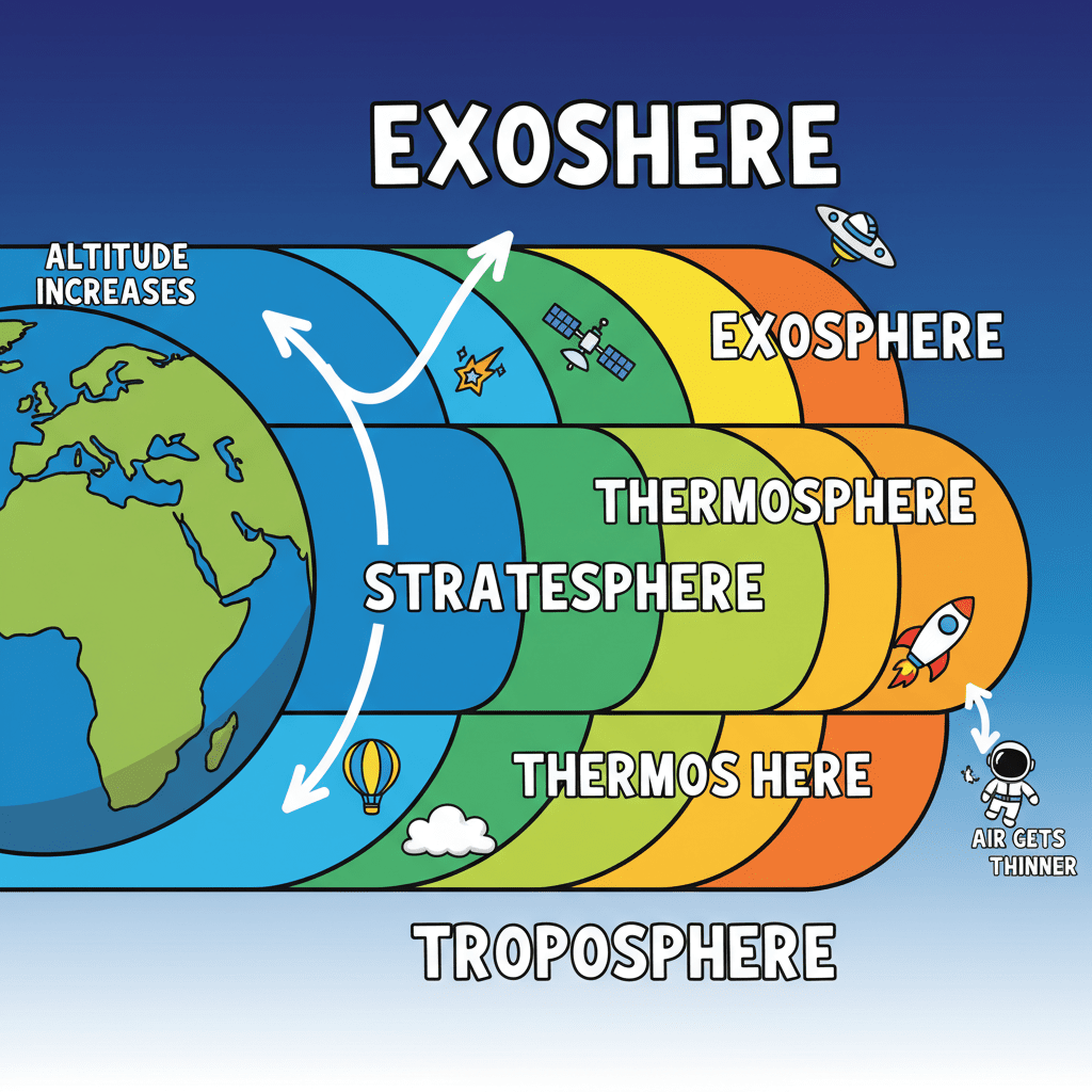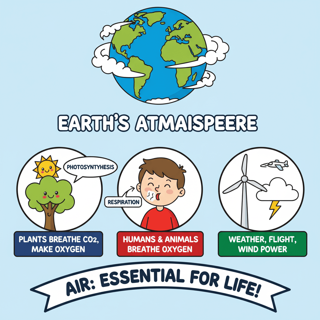 Air is essential for life on Earth. It provides the oxygen necessary for the survival of all living beings. The atmosphere extends hundreds of kilometers from the Earth's surface. However, the density of the atmosphere varies, being denser near the Earth's surface and thinning with increasing altitude.